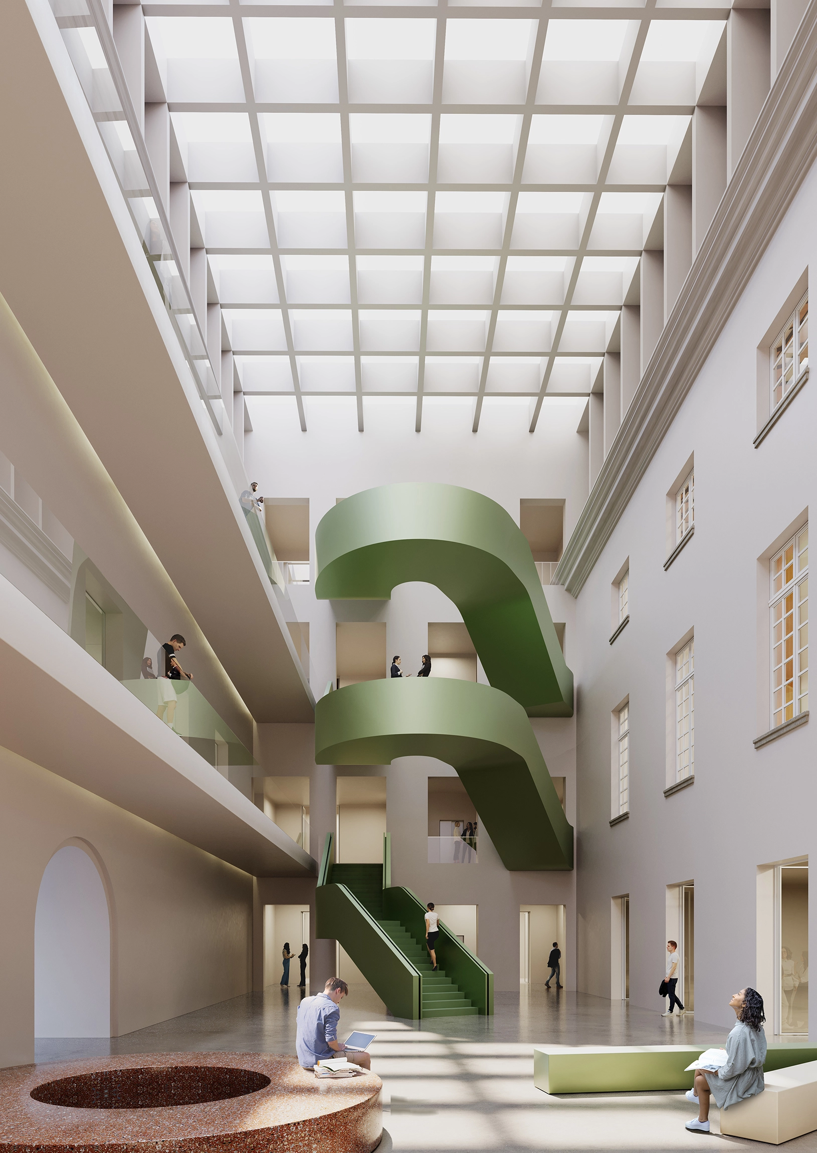 Our aim: to achieve the greatest possible outcome through a minimal number of carefully considered interventions. A university that bears its long architectural history with dignity while simultaneously meeting the demands of contemporary pedagogy. The new circulation strategy opens the building to the urban realm, creates permeability, and gives rise to representative spaces. Barrier-free, legible, and fit for the future.
