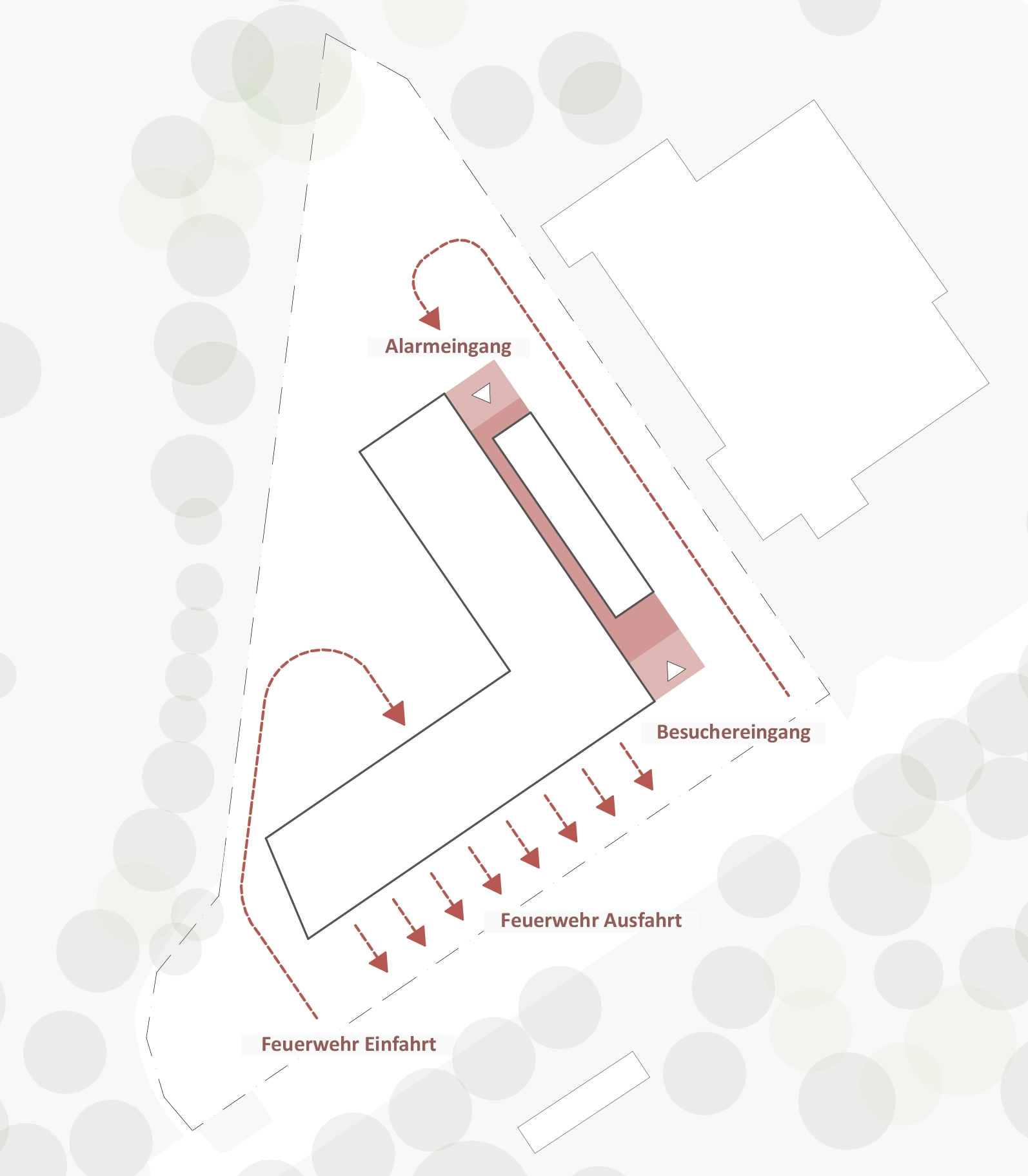 The clear separation of arriving private vehicles and departing emergency vehicles is essential for safe traffic management during operations. Wider alarm parking spaces (2.90 m) allow for quick, maneuver-free parking and support a secure alarm chain.