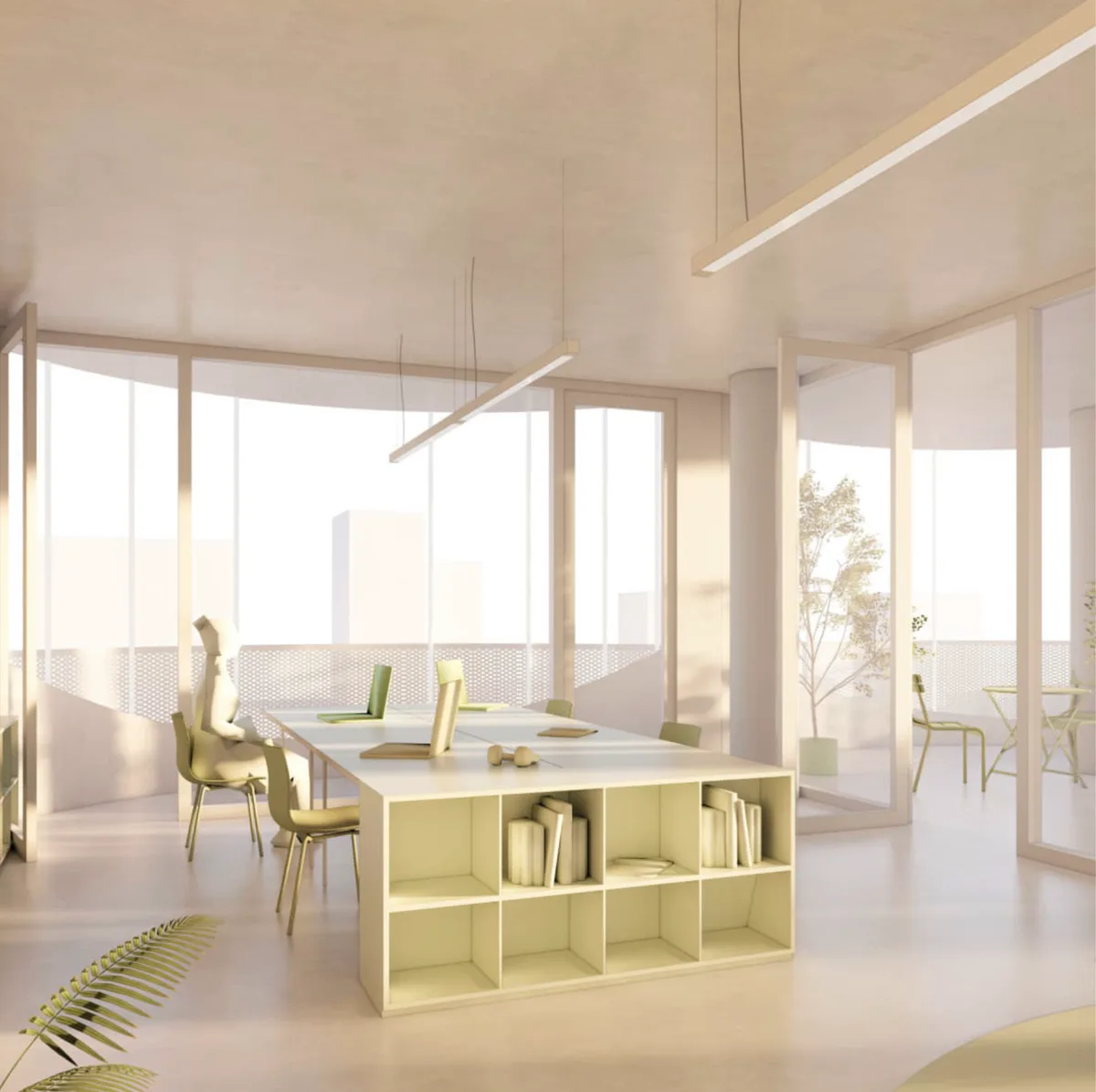 Der Entwurf denkt Nachhaltigkeit ganzheitlich. Die Baukörper entstehen in einer Mischkonstruktion aus CO₂-reduziertem Recyclingbeton und Massivholzdecken. Von Beginn an werden Trennbarkeit und Wiederverwertbarkeit der Bauteile mitgedacht. Photovoltaik und eine Wasser-Sole-Wärmepumpe sichern eine ressourcenschonende Energieversorgung. Auf allen Ebenen entstehen grüne Freiräume, die nicht nur ökologische und energetische Funktionen übernehmen, sondern auch soziale Qualitäten entfalten.