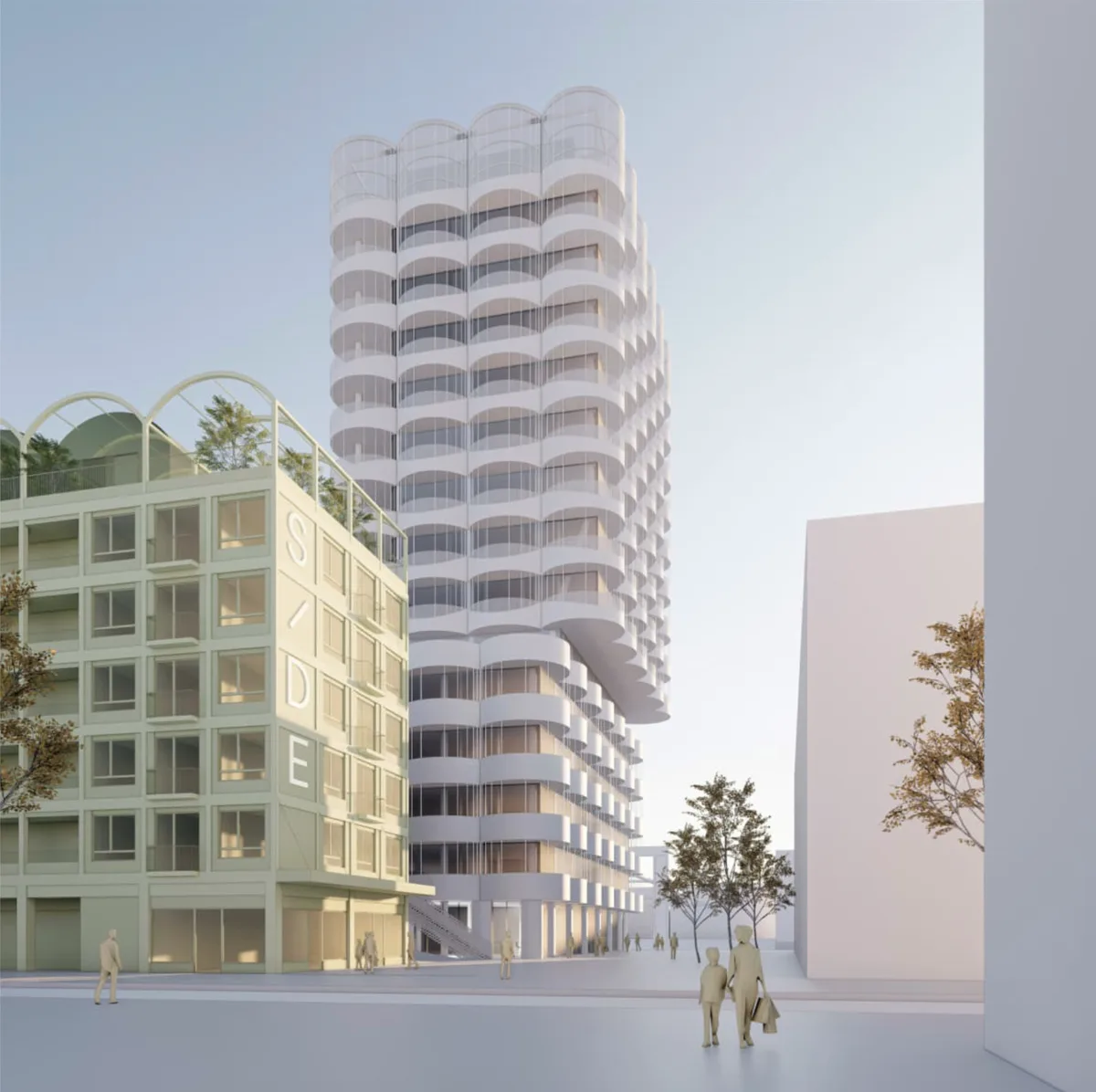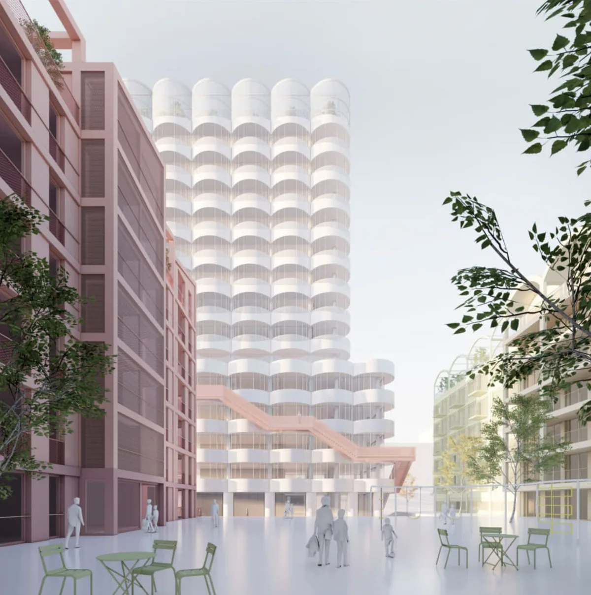 Der Sockel des Turms bezieht sich auf den Maßstab der Nachbarschaft, beherbergt neue Arbeitswelten und verbindet sich durch die Freitreppen und Balkone direkt mit dem Hof und dem Vorplatz.