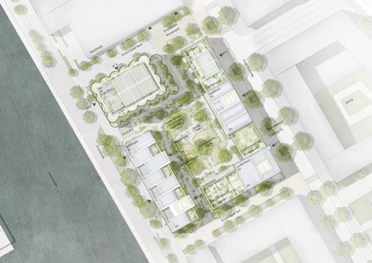 Das Quartier lebt von geplanten wie zufälligen Begegnungen. Wohnen und Arbeiten werden hier nicht voneinander getrennt, sondern bewusst miteinander verbunden. Der Vorplatz im Norden wird vom Café, derMarkthalle und dem Showroom belebt, während das Foyer des Silos den Übergang zur Promenade markiert. An der Westseite ergänzen Gastronomieeinheiten im Sockel der Hafenhalle das öffentliche Angebot, während sich zum Poller Kirchweg hin Einzelhandel, ein Gemeinschaftsraum mit Küche und Waschküche sowie Atelierwohnungen mit Werkterrassen orientieren. Im Innenhof entsteht ein gemeinsamer Ort des Alltags: Wasserspiel, Generationenspielplatz und große Tafel bieten den Bewohner:innen Raum für Begegnung und Zusammenhalt.