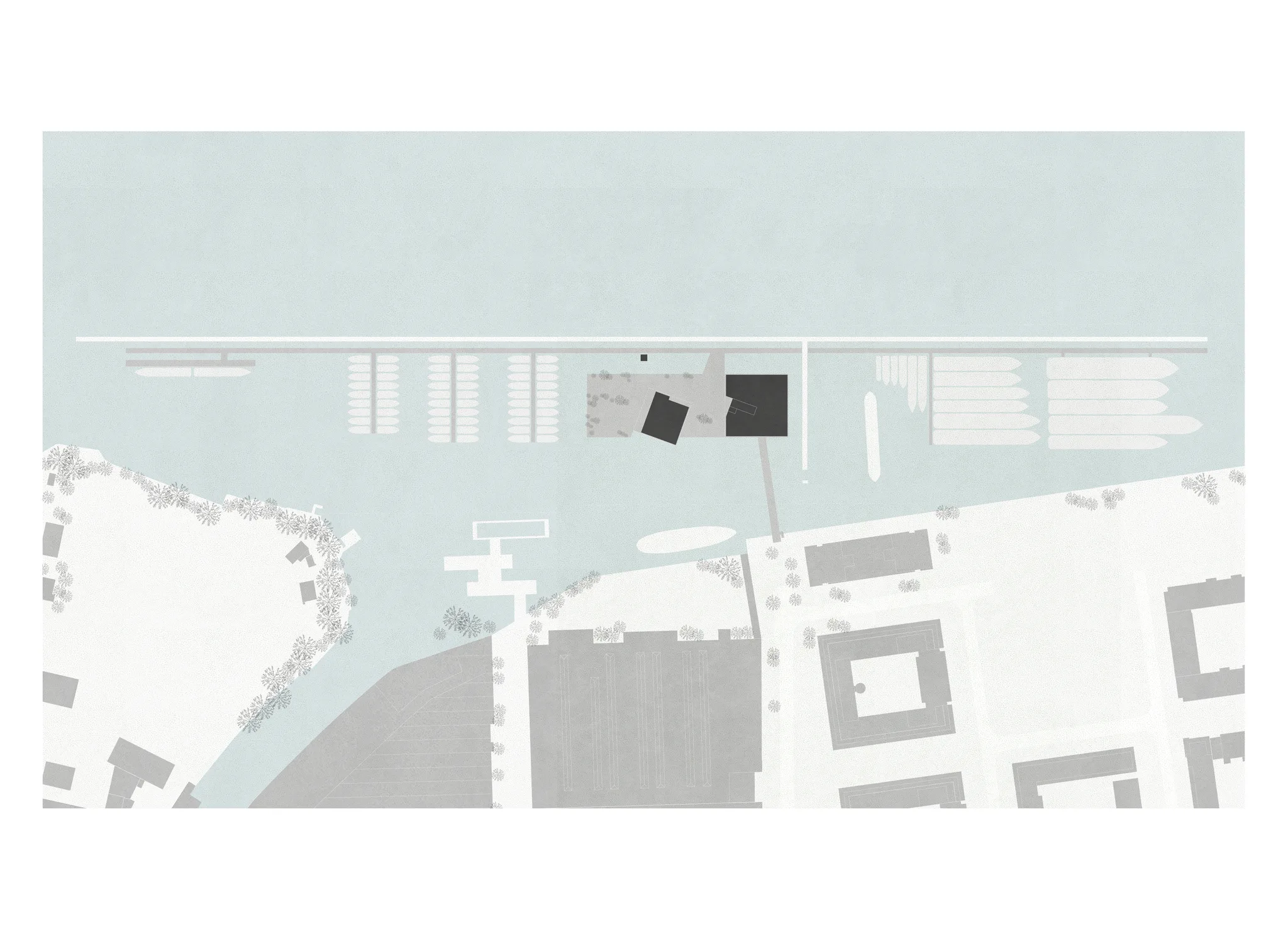 Das Museum markiert die Schnittstelle zwischen Gedenken und öffentlichem Leben. Ein klarer Baukörper, umhüllt von einer leichten, beweglichen Fassade aus Bootstauen, die mit Wind und Licht spielt, ein Echo auf Wasser, Schiff und Strömung. Dahinter eine flexible Struktur: mal geschlossen, mal transparent, offen für Ausstellungen, Workshops, Veranstaltungen.