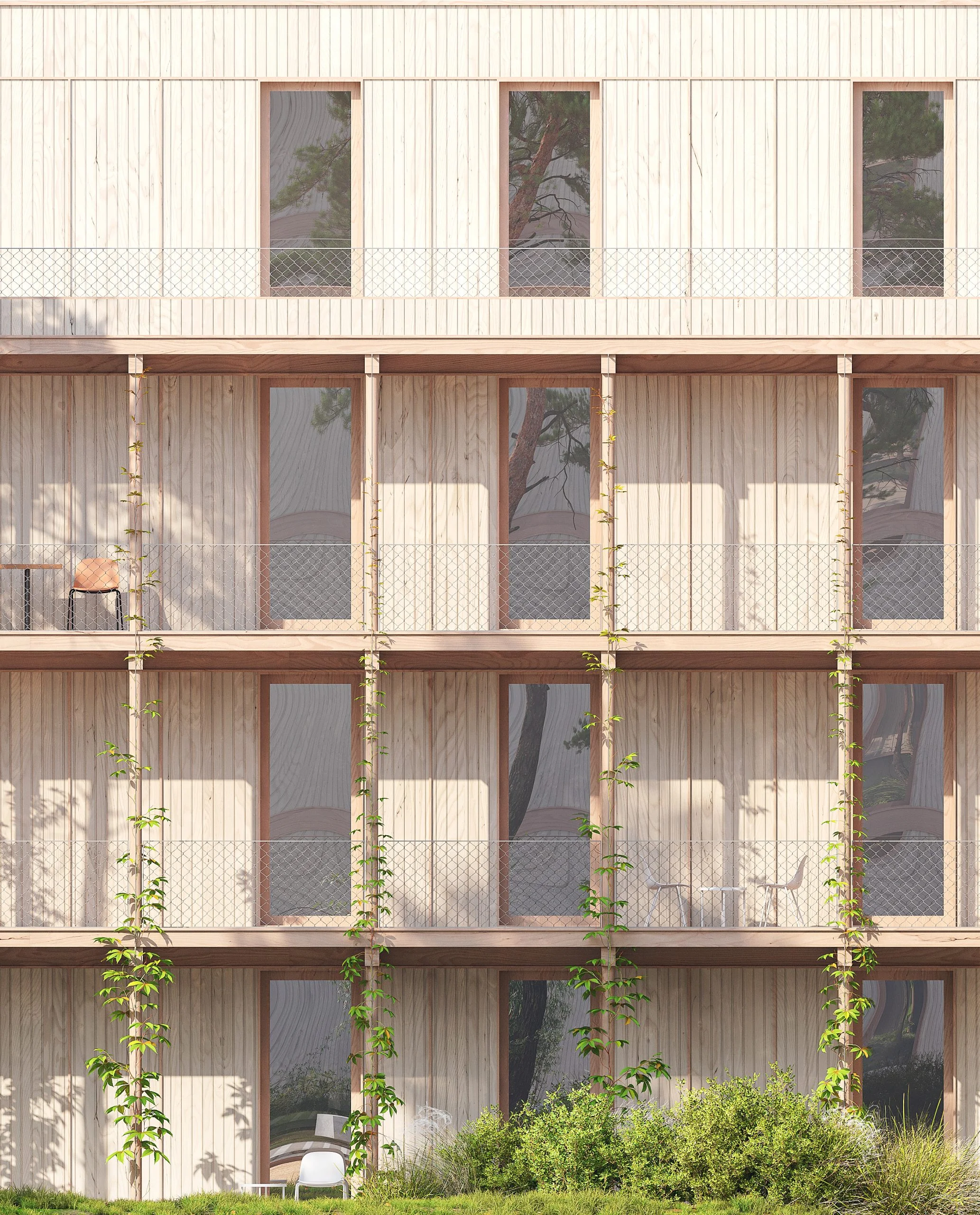 In Köln-Bocklemünd sollen bis 2026 etwa 160 Wohnungen und eine Kindertagesstätte entstehen. Der Entwurf verfolgt ein sowohl ökologisch und ökonomisch als auch sozial nachhaltiges Konzept. Außenwände aus Massivholz, eine Innenverkleidung aus schnellnachwachsenden gespachtelten Strohbauplatten sowie demontierbare Verbindungen, die eine Wiederverwendung ermöglichen, kommen zum Einsatz. Flächeneffiziente Grundrisse, begrünte Fassaden, Spielplätze und zahlreiche Fahrradstellplätze sowie die klimaneutrale Energieversorgung runden das Konzept ab.